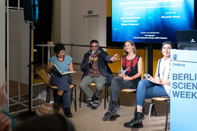01/11/2024 - TalkThe Berlin Museum of Natural History hosted the panel discussion “Ecopolitics Traversing Waterbodies: Tales and Epistemologies Influencing Water Governance” as part of Berlin Science Week 2024. Organized by the Ecopolitics and Just Transformations research group (EcoPol), the session brought together panelists Shyam Wuppuluri (Fellow, RIFS), Jenny García Ruales (Amazon of Rights Project, Max Planck Institute for Social Anthropology), and Şermin Güven (Associate Member of Disaster Research Unit FU-Berlin), with moderation by Elisabeth Weydt. Over the last three years, EcoPol has used this platform to delve into diverse ecopolitical dimensions of commons, and this year’s focus on water governance highlighted often-erased narratives and marginalized epistemologies.